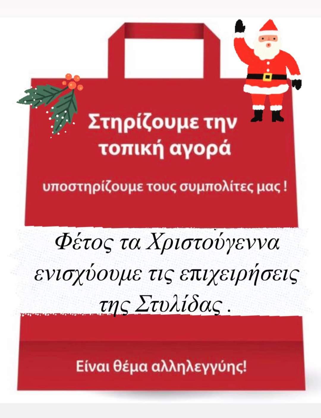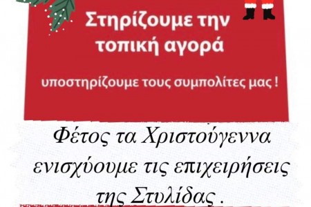 Εν όψει της εορταστικής περιόδου των Χριστουγέννων θα ήθελα προσωπικά, αλλά εκ μέρους της Δημοτικής Αρχής, να σας καλέσω να στηρίξουμε όλοι μαζί την τοπική αγορά και τις τοπικές επιχειρήσεις του Δήμου μας, ως πράξη αλληλεγγύης στους συνδημότες μας.